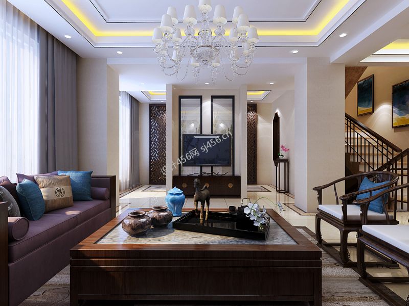新中式大户型客餐厅吊顶装修效果图
