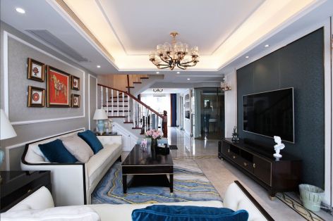 130平美式简约三居室客厅吊顶装修图片
