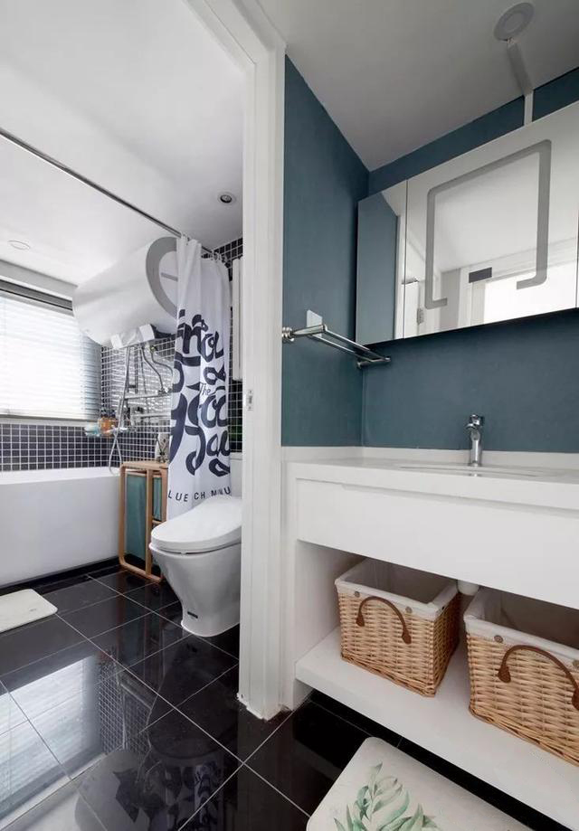 漱洗区面盆应选择小巧玲珑型的,尽显干净利落,不会有多余的装饰,但是镜子是必不可少的装备,我们常用方形的镜子应该和简洁的毛巾架和面盆几乎同高,使用起来比较方面、快捷。