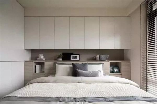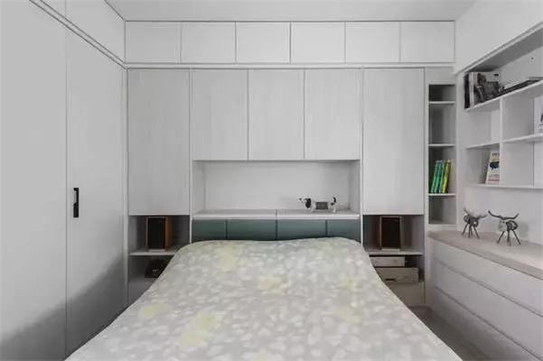 小户型卧室也有许多屋主会把床放在其中一侧,那么另一侧就可以选择做上到顶的柜子,给柜子搭配一些开放式的格子,避免太过压抑。