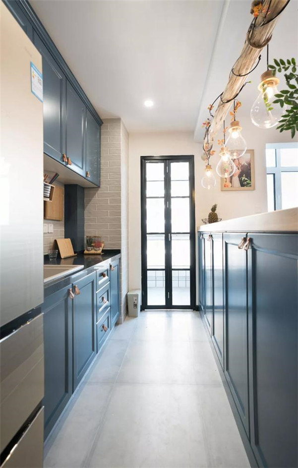 厨房的面积比较小,做了一字型的橱柜,冰箱和烤箱等都嵌入柜子当中,和客厅之间的隔断柜上方做了木质造型和摆放灯具,展现自然感。