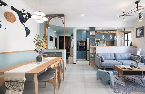 整个客餐厅的颜色是以白色与浅蓝色为主,地面铺设浅灰色的地砖,再加上原木色的家具,给人一种清新、自然的感觉。