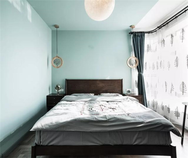 主卧室延续了客餐厅的色彩搭配方案,卧室内的飘窗被完全砸开,让卧室看起来宽敞了不少,弧形落地窗的设计也让人感觉卧室非常明亮、舒适。