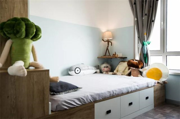 次卧是做了榻榻米床的设计,留出更多的面积给孩子玩耍,榻榻米床的侧方还抬高了部分,用来代替床头柜还在床尾做了个小隔板,更为实用。