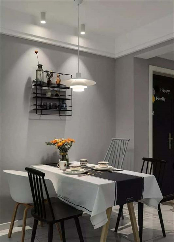 餐厅,在墙面安装了一个铁艺置物架,摆放些水杯和小装饰物,是极好的。
