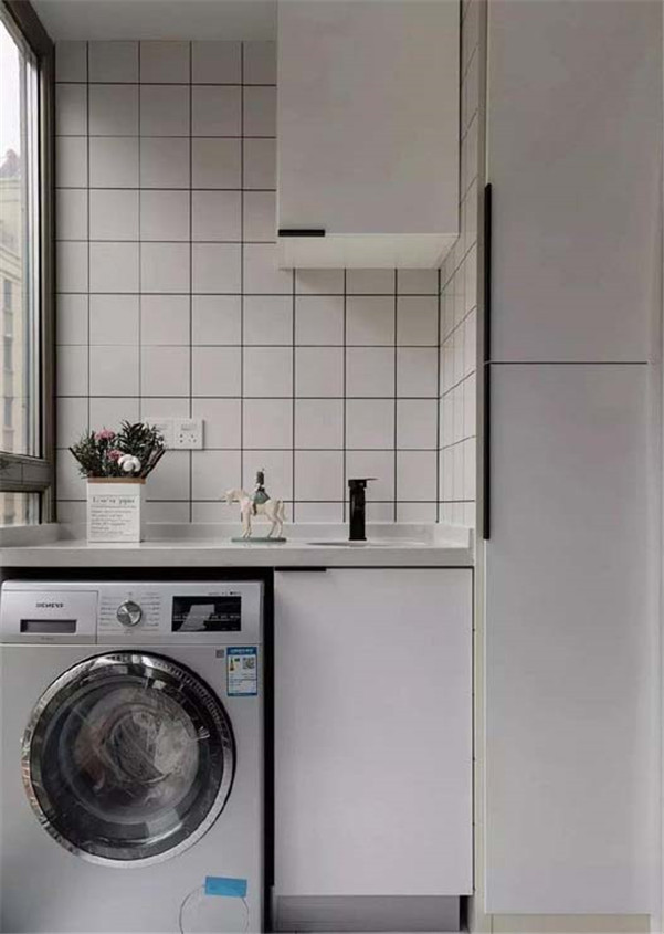 阳台和大部分人家一样,选择在一侧设计出收纳柜和洗衣区,注重功能性的打造。