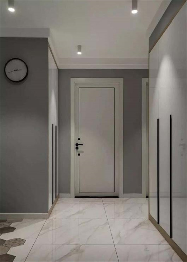 入户玄关,墙面以灰色调为主,看起来就特别的时尚大气。地面加入了六边形砖,还是蛮有个性的。