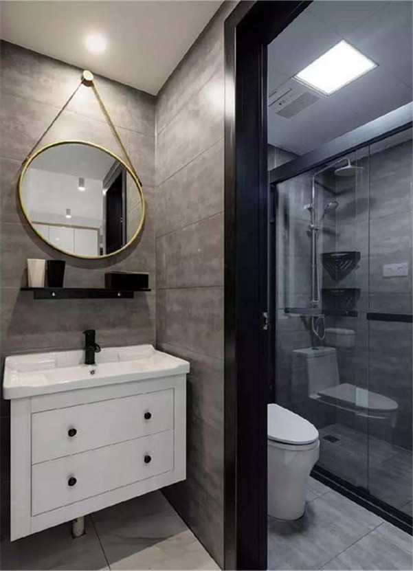 卫生间墙砖和地砖都是水泥灰的色调,所以看起来有点工业风的味道,不过白色家具起到了不错的中和作用。三式分离的布局也是蛮不错的。