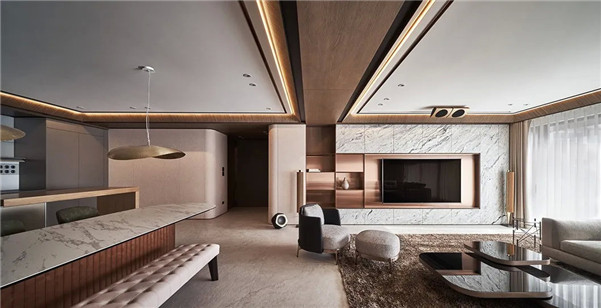 客厅的功能主要有招待客人、视听和阅读,环境光只需均匀照亮整个区域即可,无需太过强烈,采用分散光源能更好地调节空间亮度。