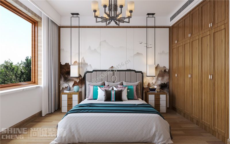 新中式风格138平三居室卧室背景墙装修效果图