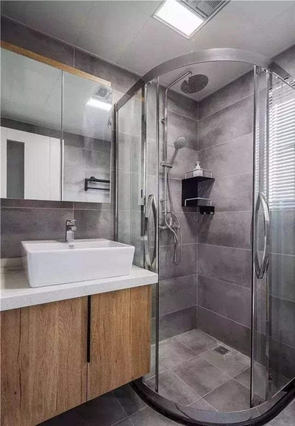 主卧卫生间,安装了淋浴房进行干湿分离,水泥灰瓷砖,十分有格调。