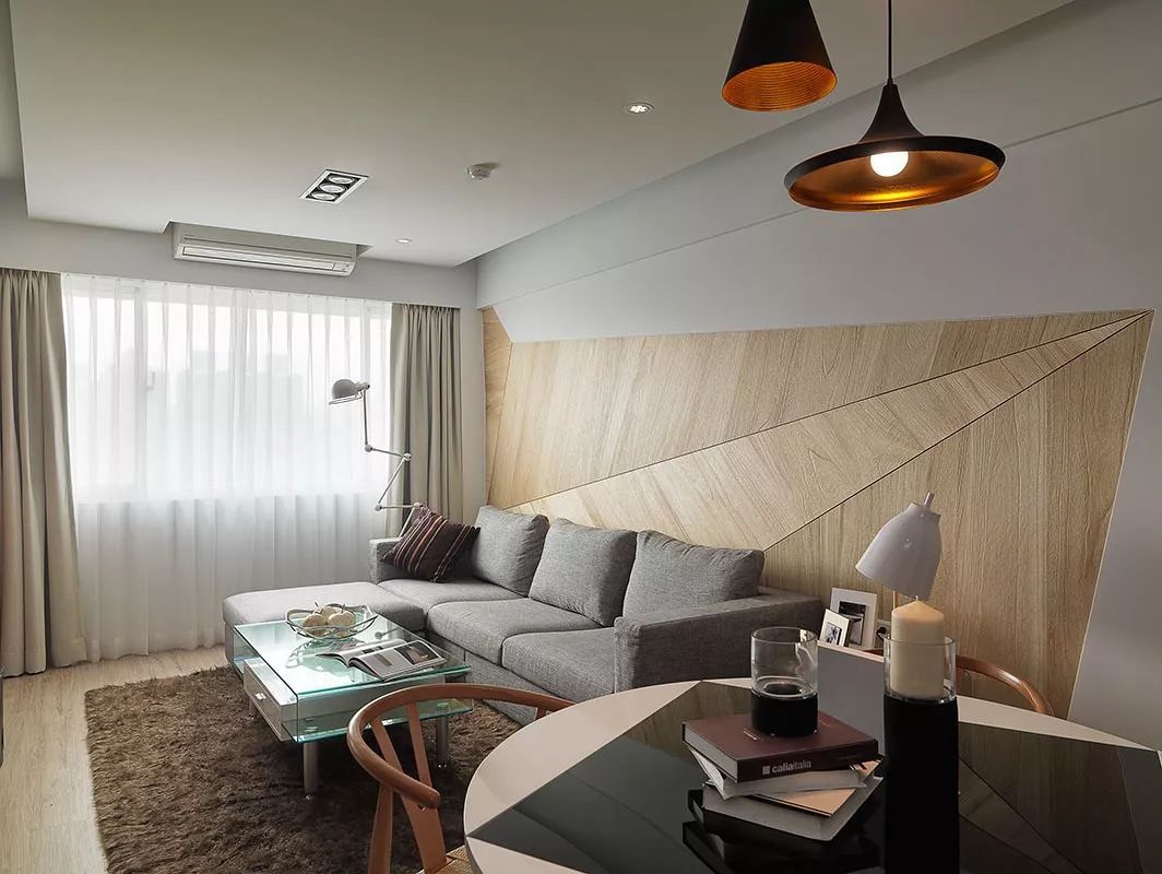 设计攻略:利用石膏板做弧度造型,连接沙发背景墙与阳台隔断墙,后期根据墙面材质进行表面装饰皆可。