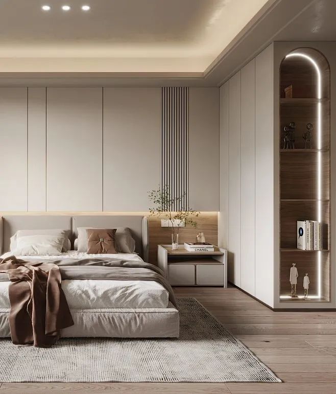 自带阳台的卧室,非承重墙的情况下,将阳台打通并入室内,衣柜设计在阳台两侧,充分利用凹陷空间且不会遮挡光线,丰富储物功能的同时,让卧室更显完整与开阔。