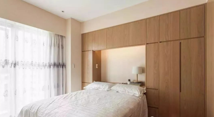 衣柜靠墙放置在床的侧边,是绝大多数人的选择,适用于纵深较大的卧室。
