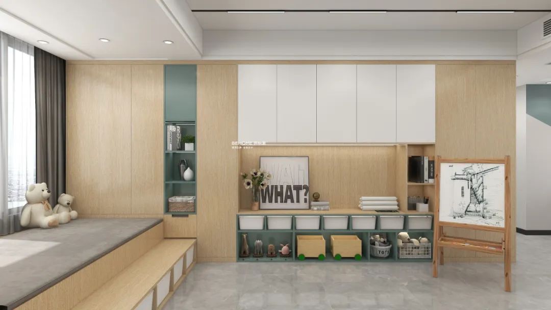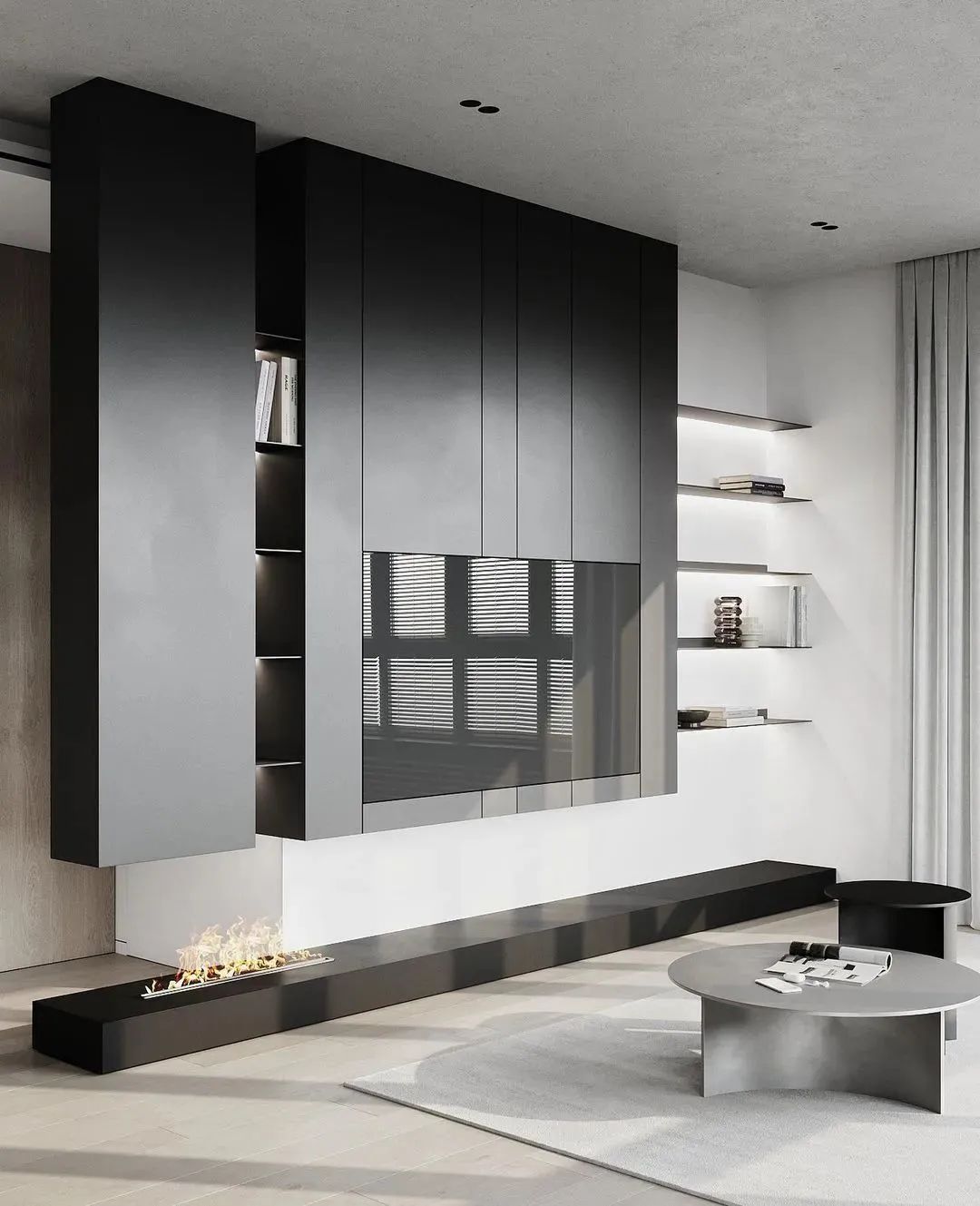 不到顶的柜子一是浪费了顶部空间,二是造成卫生问题,顶部积灰严重,时间久了会成为清洁难题。因此建议收纳柜做顶天立地设计,有效利用空间,加大收纳容量。顶部建议一般不留空,杜绝卫生问题;底部为了方便扫地机器人进入,或是出于为了缓解笨重感的设计需要,可运用悬浮柜设计,底部悬空,起到轻盈视觉的作用。