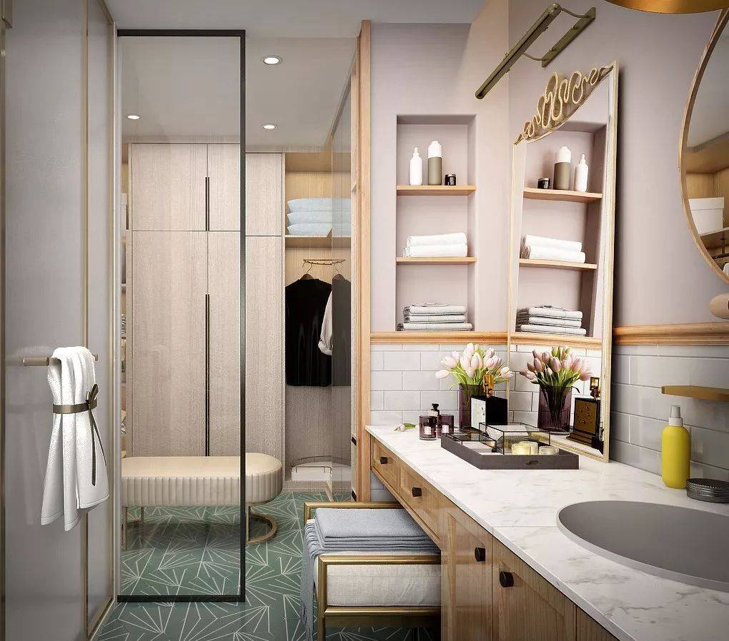 壁龛在卫浴间运用尤其多,洗浴用品有了容身之处,又省去了收纳用具。设计时造型上还可以与墙面融合在一起,作为收纳架or收纳板,铁的怕生锈,木的怕掉色,只有壁龛才能拯救潮湿的卫生间。