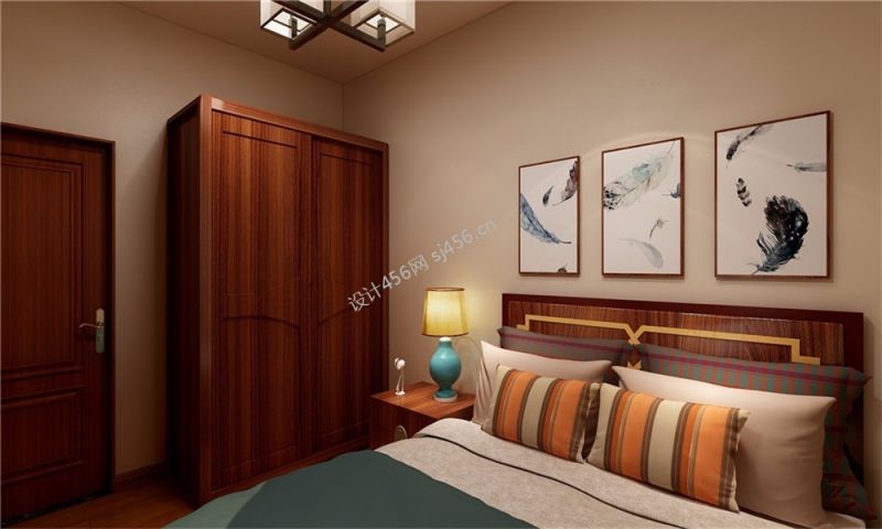 三居101平中式风格卧室设计图