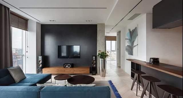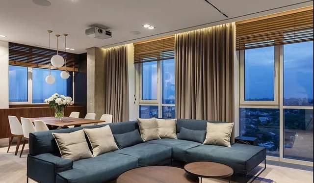 孔雀蓝的绒面沙发搭配高低不同的实木茶几,沉稳耐看。无主灯的设计拉伸层高的同时更显空间清爽高级。悬空式实木电视柜融入黑色的电视背景墙,低调中尽显高级品质。