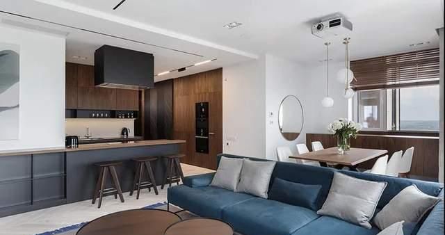 开放式的客餐厨设计让空间在视觉上更通透且更节省空间。沿着墙体打整排的悬空餐边柜,收纳空间不容小觑。厨房装吧台,无形中加大使用空间,吧台也可作为小型餐桌使用,增加一家人的情感交流。