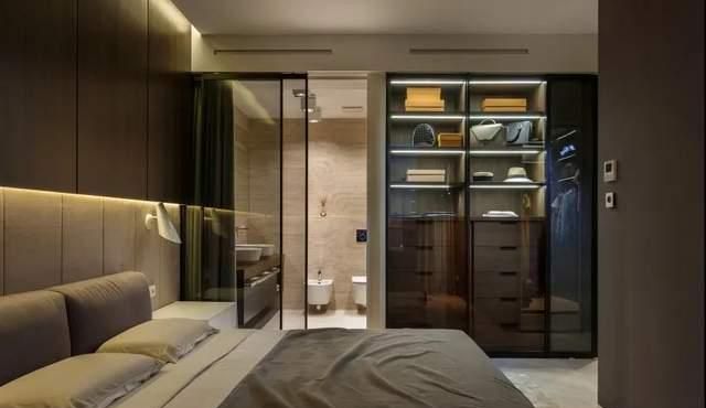 主卧床头上方打一整排吊柜,收纳空间翻倍。吊柜下隐藏灯带配合两边白色吊灯,营造出质感不扎眼的空间氛围。卧室内有独立的卫生间,并且利用一面墙装上内嵌式的茶色玻璃柜,打造成衣帽间,通透性极好,加上内部的灯带,无论是照明还是装饰性,呈现的效果都很好。