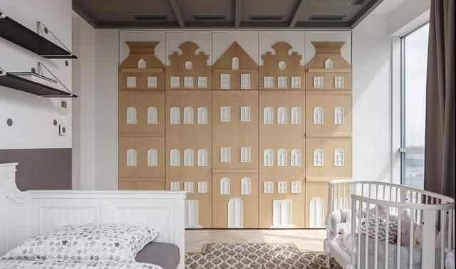 儿童房以清雅的白色为主,欧式建筑图案的衣柜搭配波点半墙,充满自然童趣。除了婴儿床还特意装沙发床,孩子可以从小睡到大,家长在旁边陪伴时也能有个休息地。