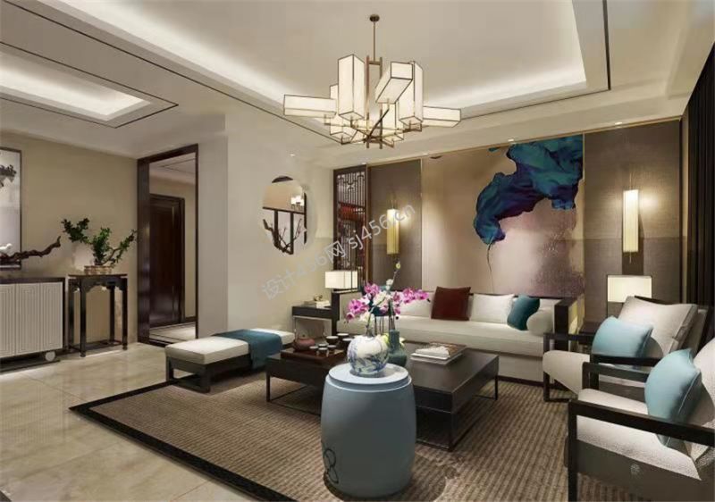 晋阳峰景150平米新中式客厅背景墙壁灯设计效果图