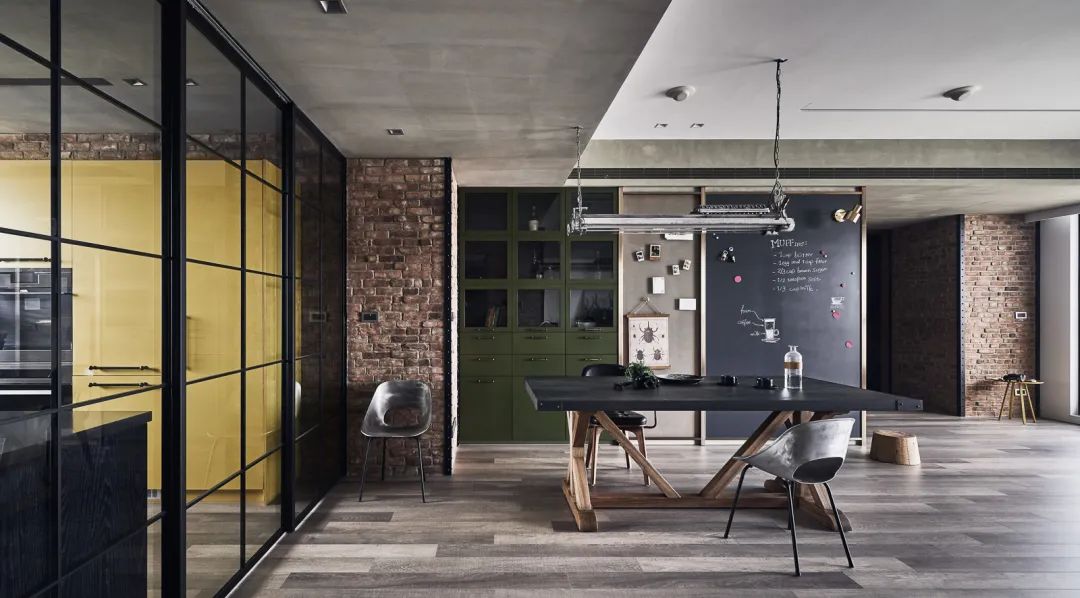 ▲餐厅侧边的墙面加入红砖墙、绿色定制餐边柜、磁吸墙与黑板墙,摆上一张黑色台面的餐桌,让用餐空间显得更加小资端庄而高 档。