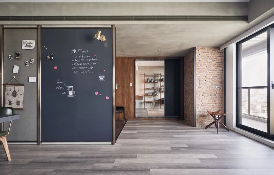 ▲餐厅旁边的墙板刷成黑板墙,左侧的是磁吸墙,整个空间显得精致高级而有趣。