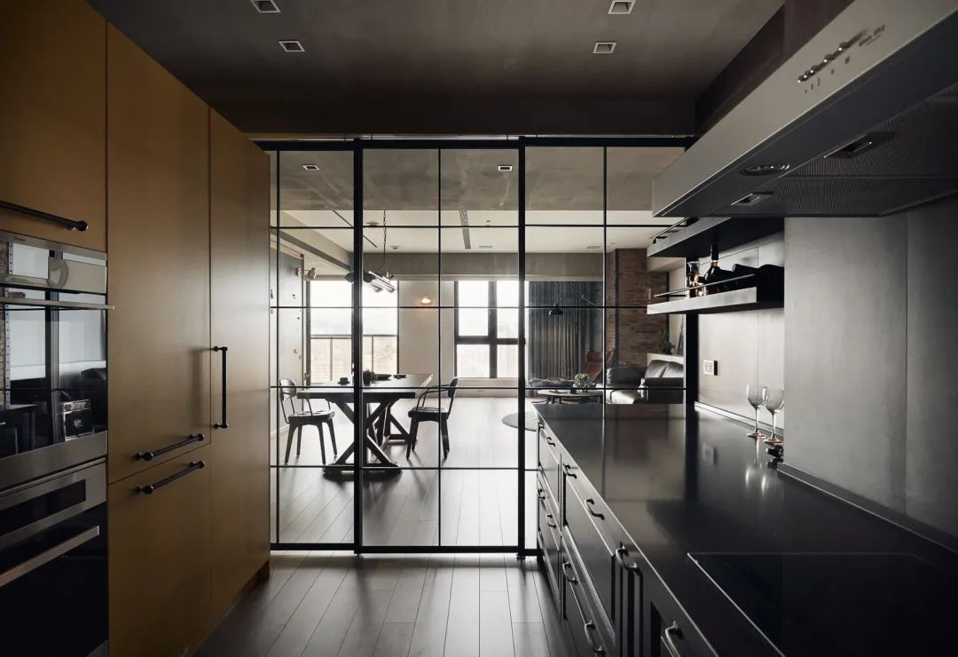 ▲厨房与客厅隔着大面积的玻璃推门,定制入墙式的电器柜,还有黑色的橱柜与灰色墙面,让做饭空间也是实用而高端。