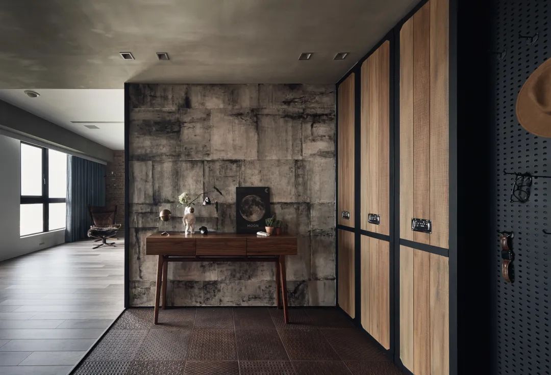 ▲玄关的地面、墙面都是灰色的仿古砖,侧边是入墙式鞋柜与洞洞板收纳架,整体空间深色小资的空间,布置一张铁艺框架+皮艺坐垫的换鞋凳,实用而又优雅。