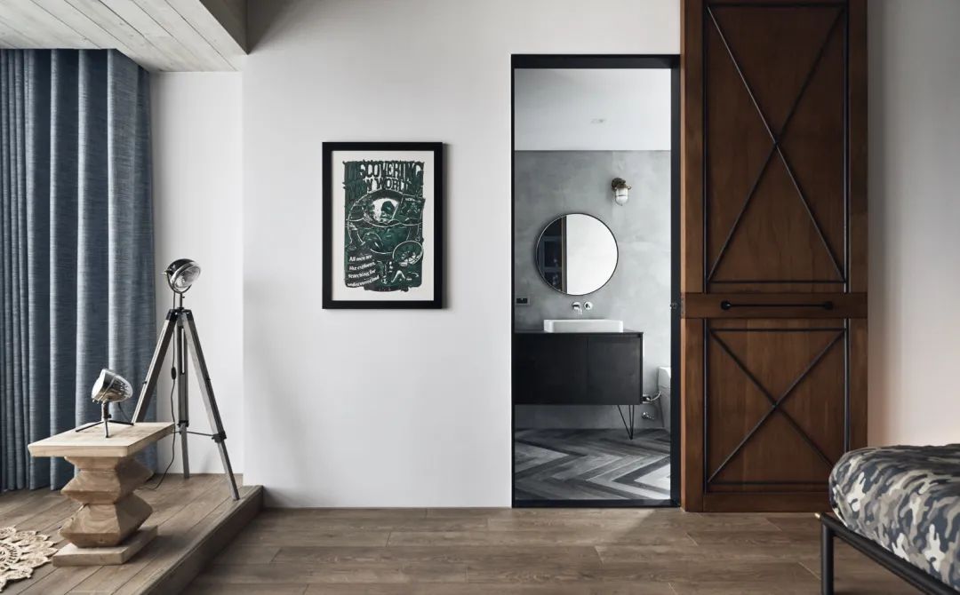 ▲主人卫生间以谷仓门的设计,里面灰色的墙面与地面,也是与空间保持一致的格调,显得更加高级精致。