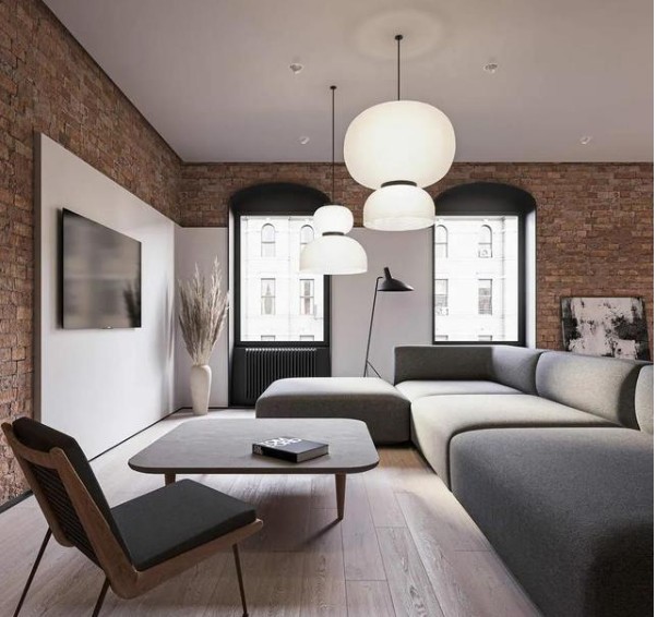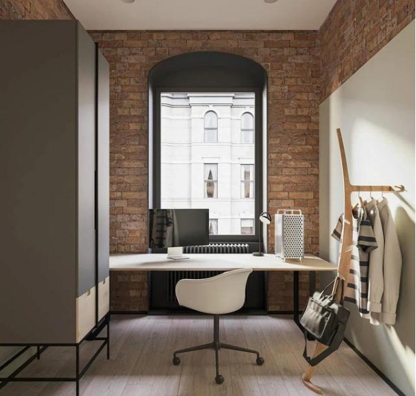 简约的灰色布艺沙发与实木茶几彰显了户主低调利落的生活品位,复古红砖塑造的墙面与木地板共同传递着天然材料特有的质朴、原始野性的气质。一部分突出的电视墙刷成白色,延伸至两扇窗前,黑白交相呼应,展现出空间的层次感。