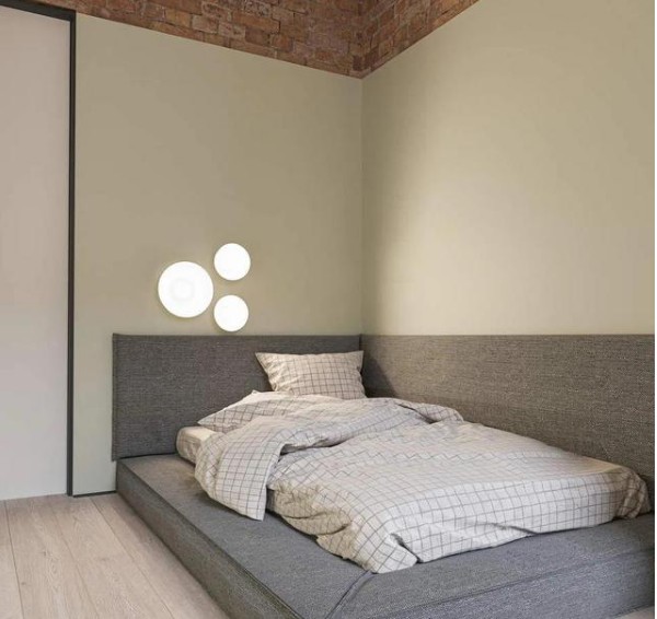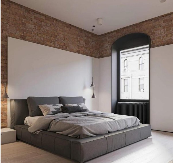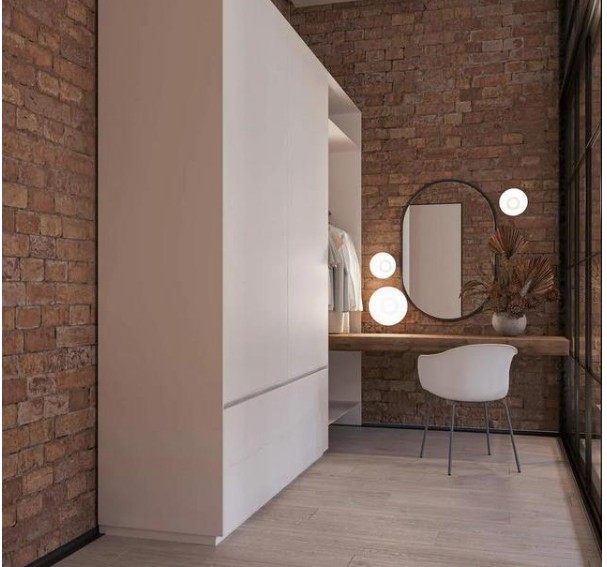 主卧床头背景墙采用了与客厅一致的红砖+白墙的设计,为简单的起居空间增加层次感。深灰色布艺床搭配床头同色系垂线吊灯,营造沉稳静谧的氛围。休息区域与衣帽间以玻璃门作为隔断,通透明亮,大大的白色衣柜中延伸出来的实木隔板作为梳妆台使用,配上灯光的映衬,突显高级感。