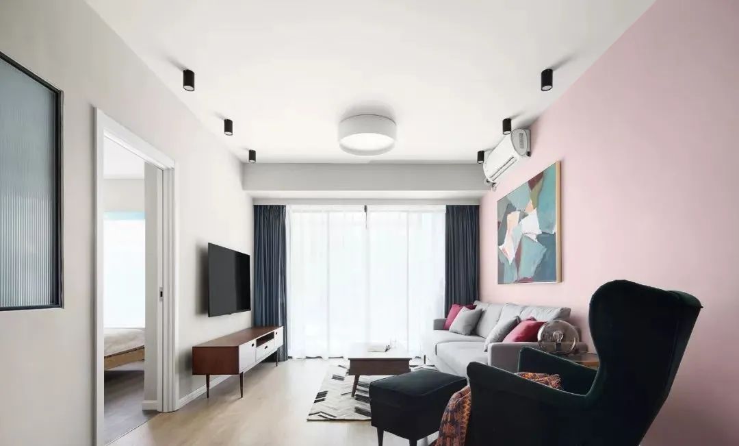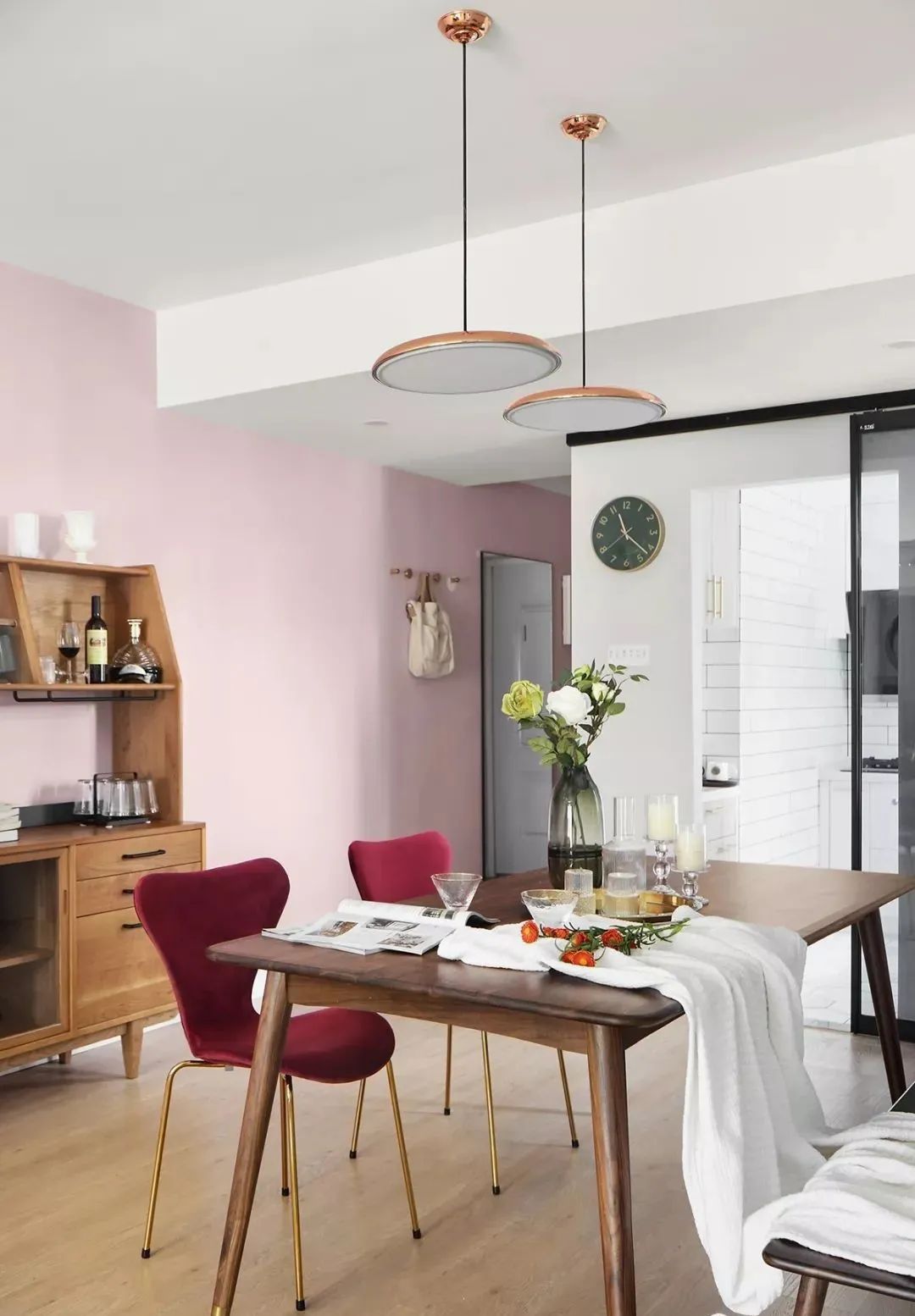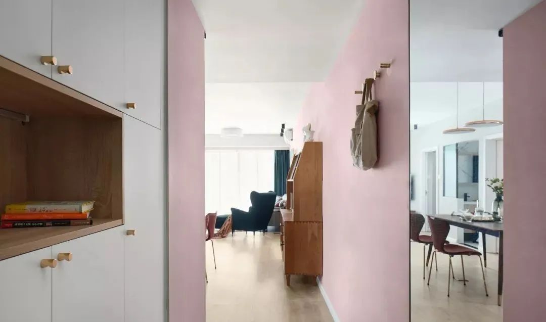 ▲客厅扩入了阳台空间更加宽敞通透,粉色墙面从玄关延伸至沙发墙,搭配灰色布艺沙发,加上一幅蓝色调装饰画,仿佛将“粉色沙滩”搬回家。
