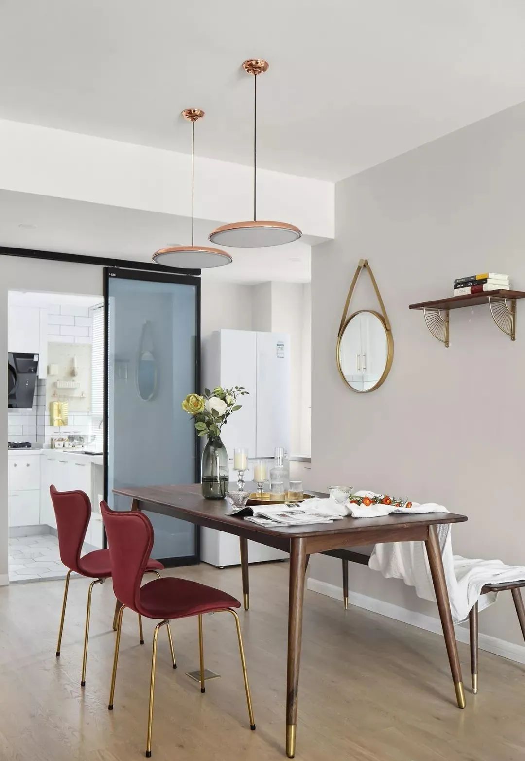 ▲餐厅,金属细脚的朱红色餐椅,胡桃木餐桌和长凳,营造出精致简约的就餐气氛。