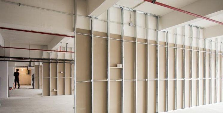 轻钢龙骨石膏板,内部是轻钢龙骨结构,外面用的是石膏板。优点是重量轻、耐火性好、通用性强,而且施工简单,因此耗时很短。如果工长需要赶工期,那么就可以用这种隔断。