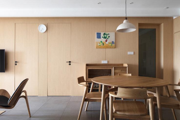 餐厅的背景墙连着客厅电视墙,木质的墙面与定制柜让空间显得自然大方。空间的照明为无主灯设计,在光线的层次上做了很细腻的处理