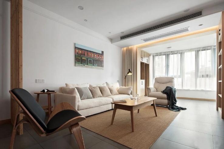 米白色布艺沙发搭配木质茶几,还有一张木质懒人椅,剑麻地毯和空间里的木质色系相同,深灰色的水泥砖衬托木材的温润质感