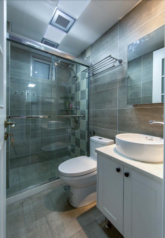 卫生间以深灰色砖石铺贴墙面,构成庄重大气,玻璃淋浴间解决了干湿的问题,让沐浴更为私密,也易于打理。