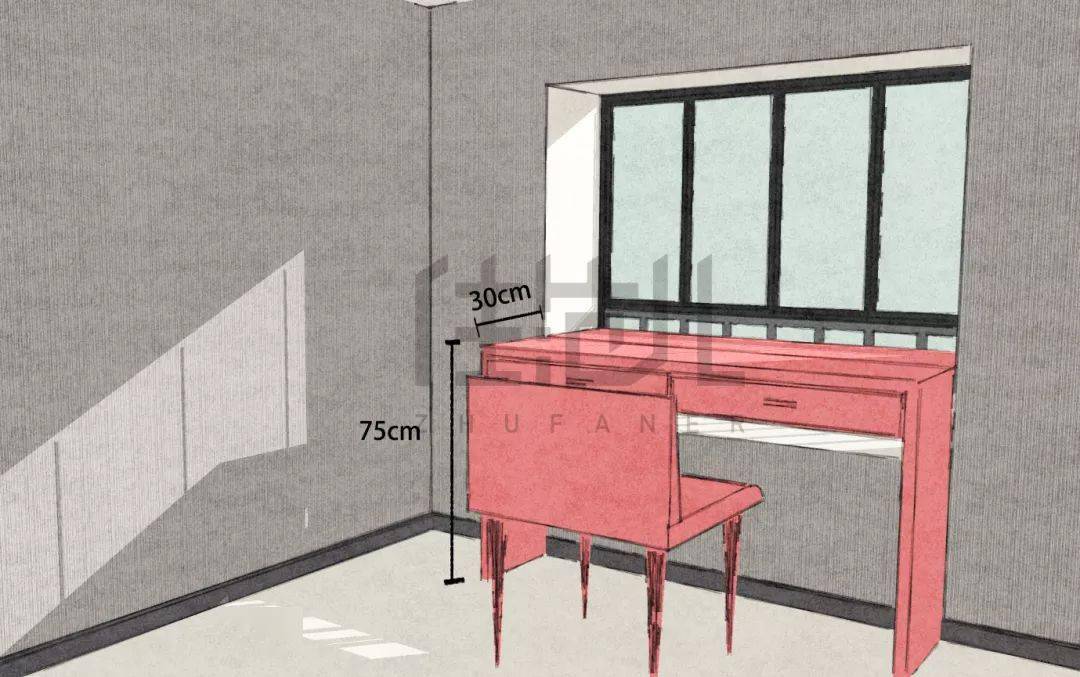 一般书桌的高度为75cm左右,将飘窗的台面延伸作为桌面,要预留出腿部活动的区域。