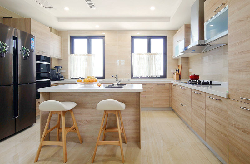 厨房的台面通常会选择人造石或者大理石等石材,工作台面高度必须在80-85cm之间,这点是厨房装修中最需要被注意的地方。灶台的左右与墙面的距离在30cm左右;安装管道时要考虑抄表的方便性,上下水管道与水槽相对应。即: