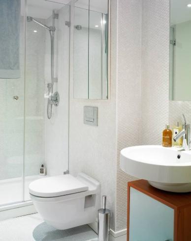 小户型无法拥有大户型的空间,只能在设计上再做精简,于是产生了这种三体合一的设计,即盥洗区、马桶与淋浴间在同一个狭小的空间,通过玻璃隔断或者浴帘隔断,同样能够达到干湿分离的效果。