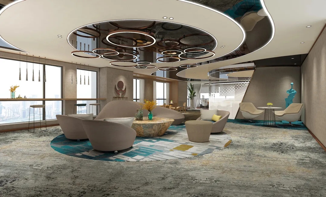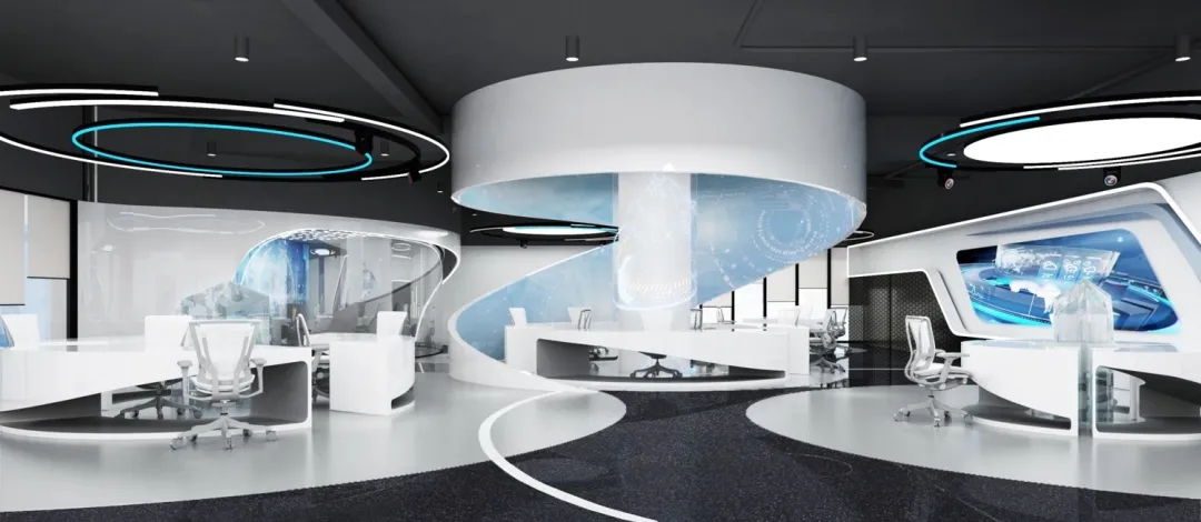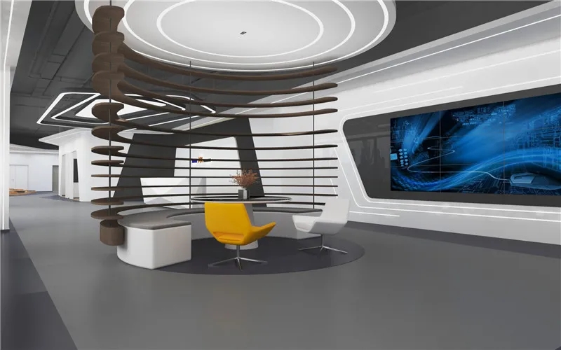 1)办公楼吊顶的造型可以非常独特,有创意。由几个圆环形组成,非常的大气,象征着公司业务的开展。