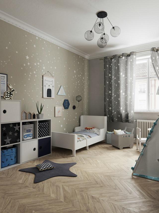 这套儿童房的地面木地板和墙面的壁纸都很漂亮,感觉大人和小孩看了都会很喜欢!