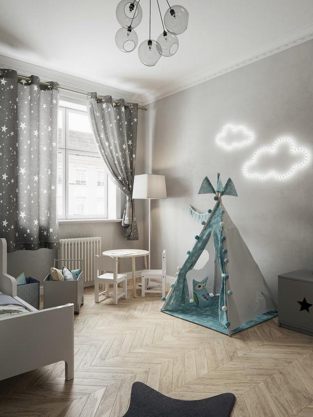 这套儿童房地面也是铺了木地板,儿童房地面建议铺地板,比较适合小孩子,脚感比较好。