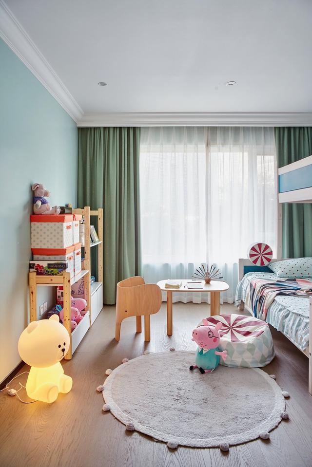 这套儿童房空间比较大,所以有休息区、娱乐区、学习区,相对来说,比较多功能化。