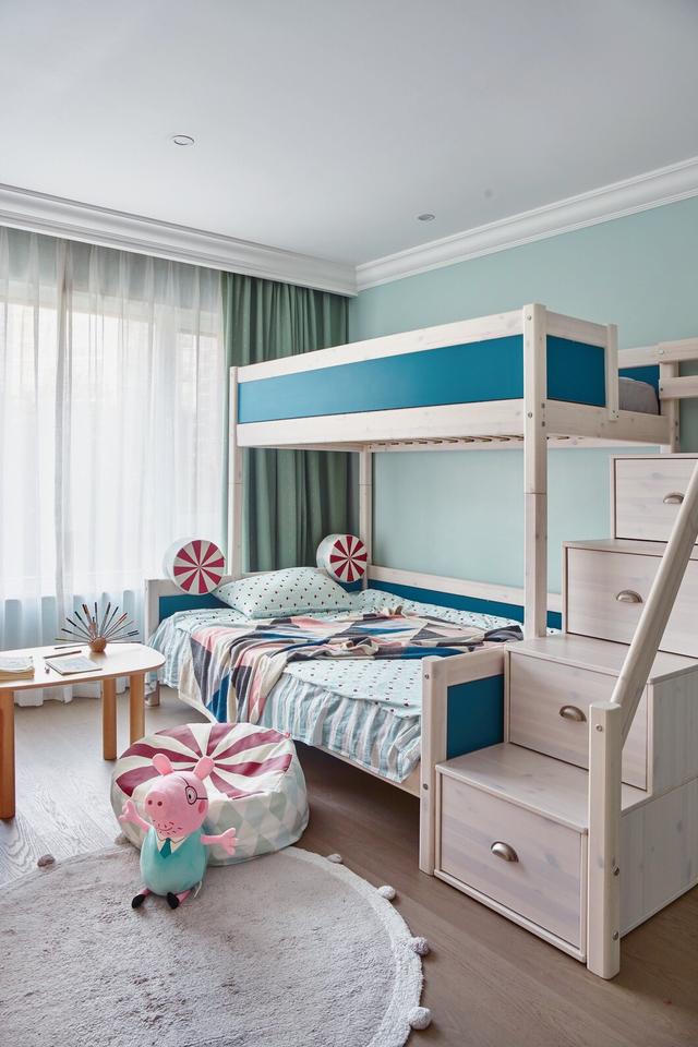 儿童床采用上下铺设计,小阶梯的地方采用柜体形式,增加收纳空间,如果你家娃喜欢这种上下铺,可以参考一下。