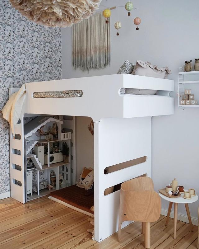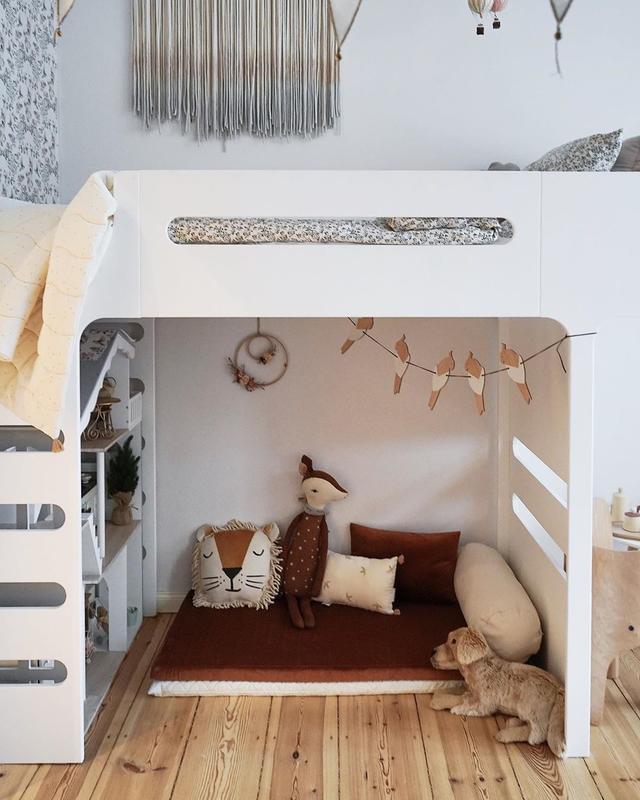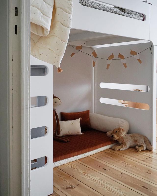 白色的小床,下方空出来做一个置物架,可以给小孩在这里玩耍,就像在一个小屋子里面,让小孩很有安全感。