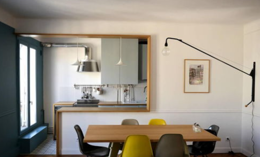 开放式的装扮时打开整体视觉最 好的方式,将烹煮区与用餐区间的墙体去除,不仅拉近了人与人之间的距离,营造出一种温馨的家庭氛围,同时也给家中带来了一种通透的视觉环境,去除了墙壁的阻挡,进一步加大了纵深。