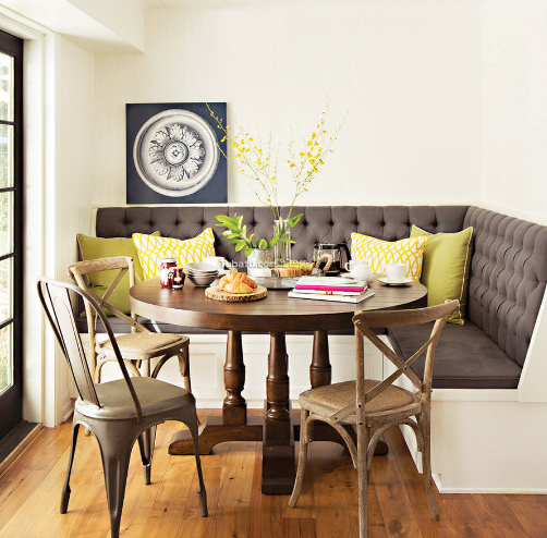 通常来讲,用餐区的墙面会粉刷成白色,因此为了起到良好的扩充区域的效果,建议用具采用浅色系,不过为了避免过于单调,建议在用餐区中加入几点亮色来调节整体的气氛,使得餐厅更具生动感。